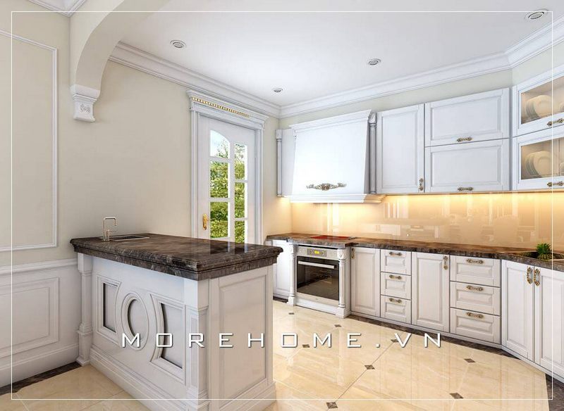 Thiết kế nội thất phòng bếp tân cổ điển sang trọng, tinh tế mang đến không gian nấu nướng tiện nghi cho người nội trợ