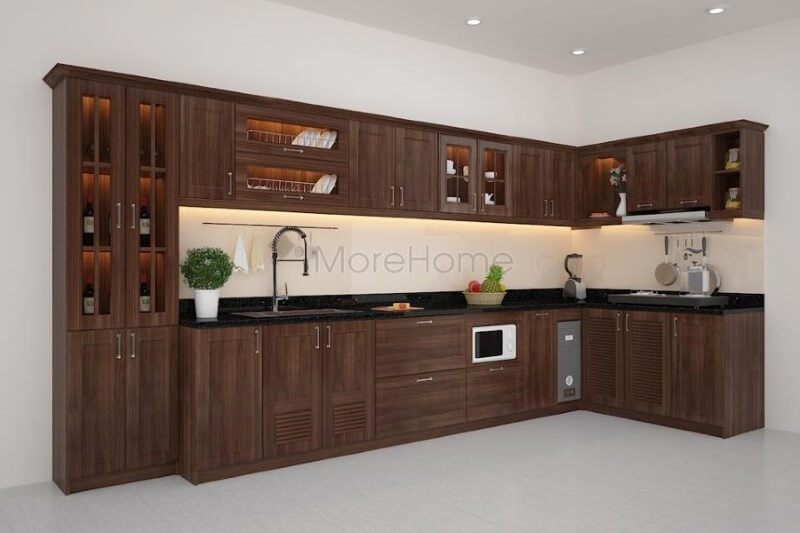Mẫu thiết kế tủ bếp gỗ óc chó chữ L được nhiều khách hàng lựa chọn với đặc tính vân gỗ sang trọng, không bị cong vênh, chịu nước tốt, bền với thời gian.