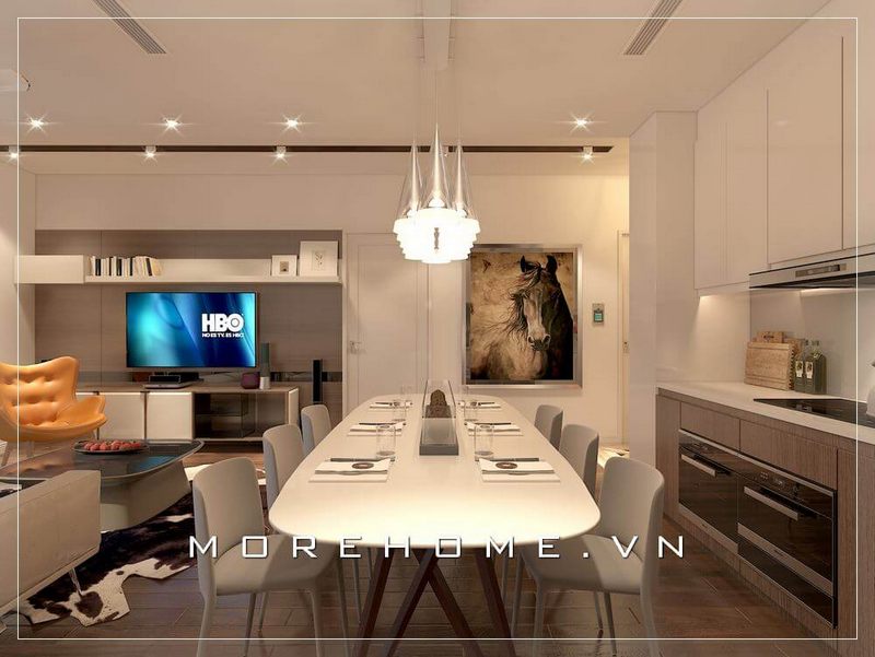 Mẫu bàn ăn hiện đại với thiết kế bàn ăn mặt đá cao cấp màu trắng, ghế eames chân sắt sơn tĩnh điện cho nội thất phòng ăn
