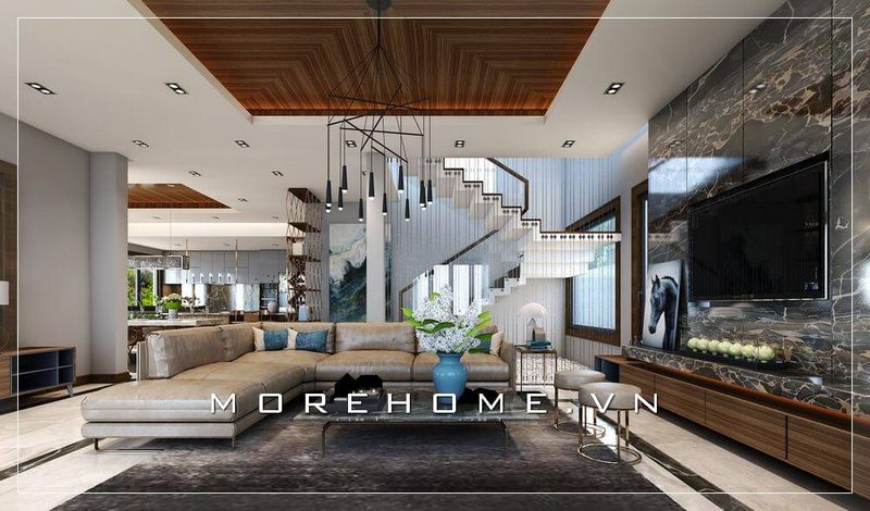 Mẫu thiết kế nội thất phòng khách biệt thự cao cấp với tông màu xám chủ đạo được yêu thích tại MoreHome