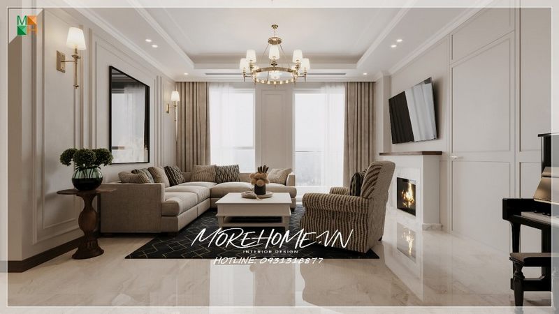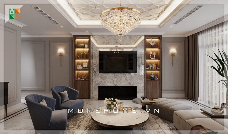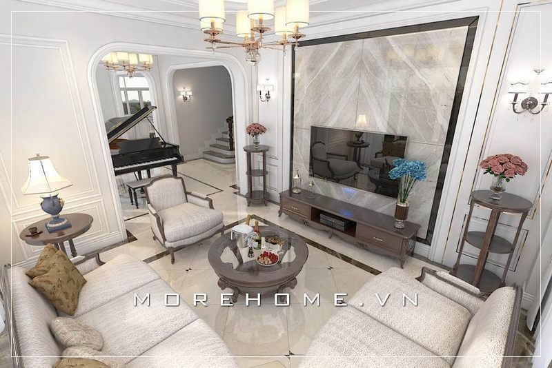 Đường nét tân cổ điển được thể hiện trên mọi không gian phòng khách biệt thự