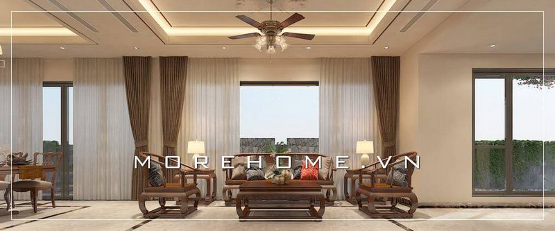 Phòng khách biệt thự, nhà phố được thiết kế nội thất bằng bộ bàn ghế sofa gỗ óc chó kết hợp với đồ nội thất trầm màu tạo nên sự hài hòa và ấn tượng.