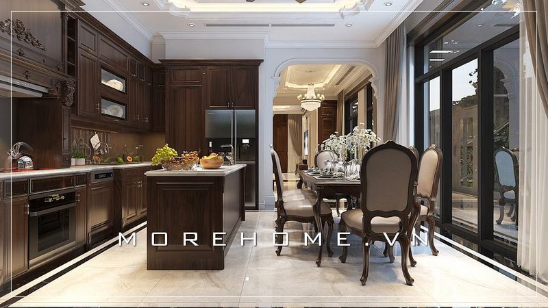 Bàn đảo bếp gỗ óc chó cao cấp có mặt bàn ốp đá trắng giúp tạo nên sự sạch sẽ cho căn bếp và cung cấp sự tiện nghi cho người nội trợ.